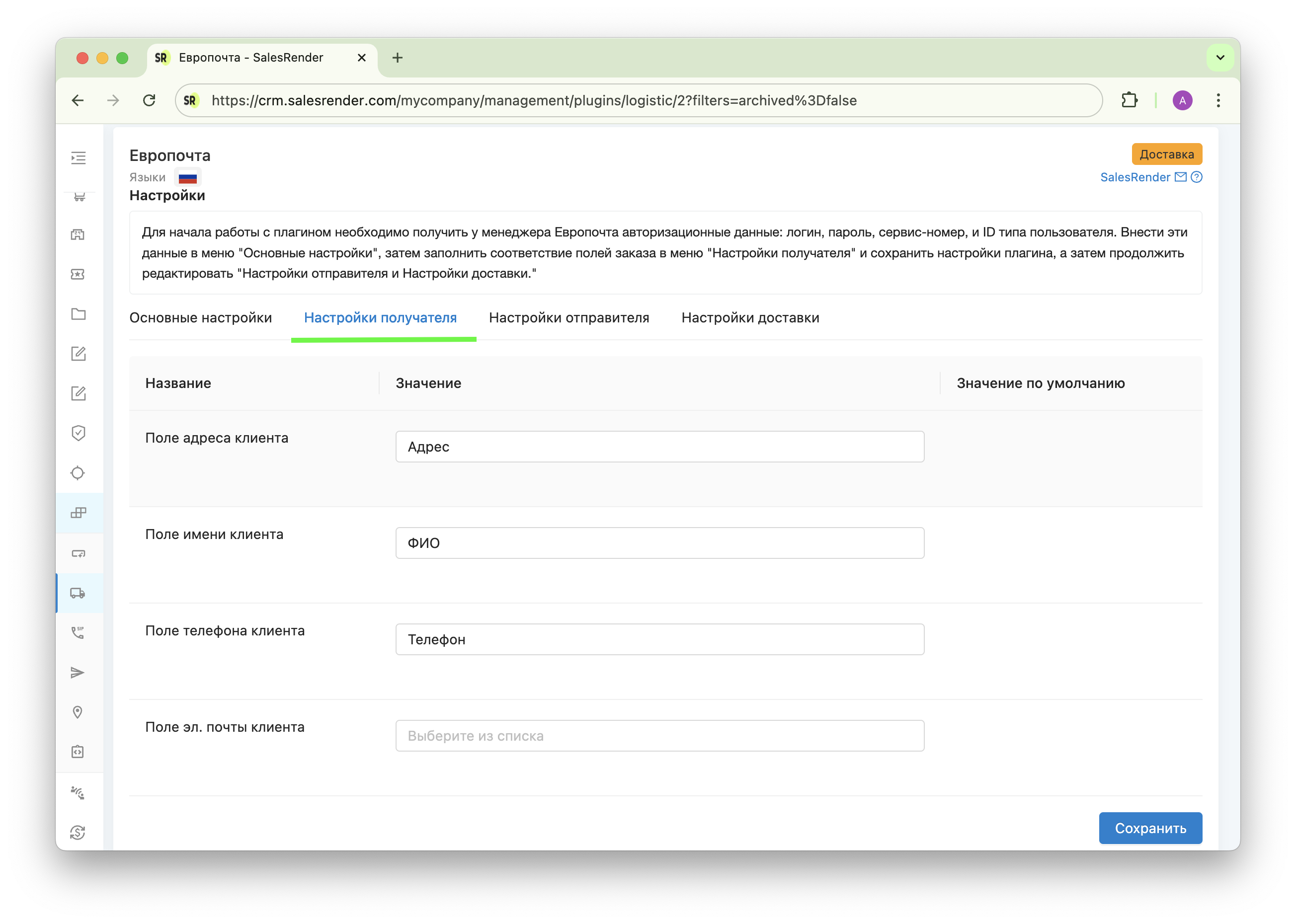 На вкладке “Настройки получателя” выберите поля, в которых у вас хранится информация о получателе. В каждой строчке будет выпадать список подходящих полей, поэтому вы точно не запутаетесь.