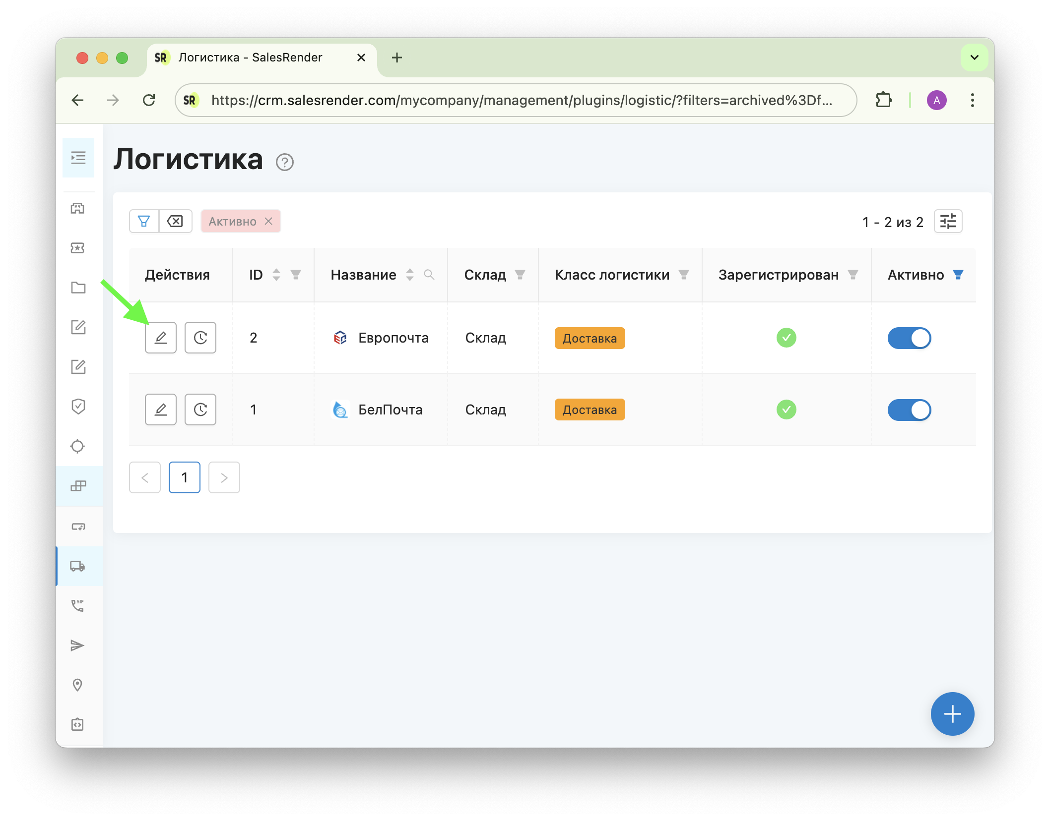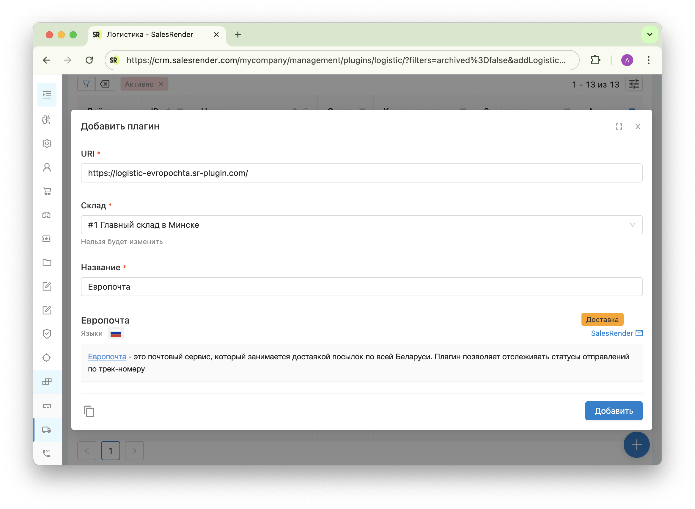 Для этого перейдите в раздел Управление - Плагины - Логистика. Нажмите на + в правом нижнем углу страницы и вставьте этот URL https://logistic-evropochta.sr-plugin.com/