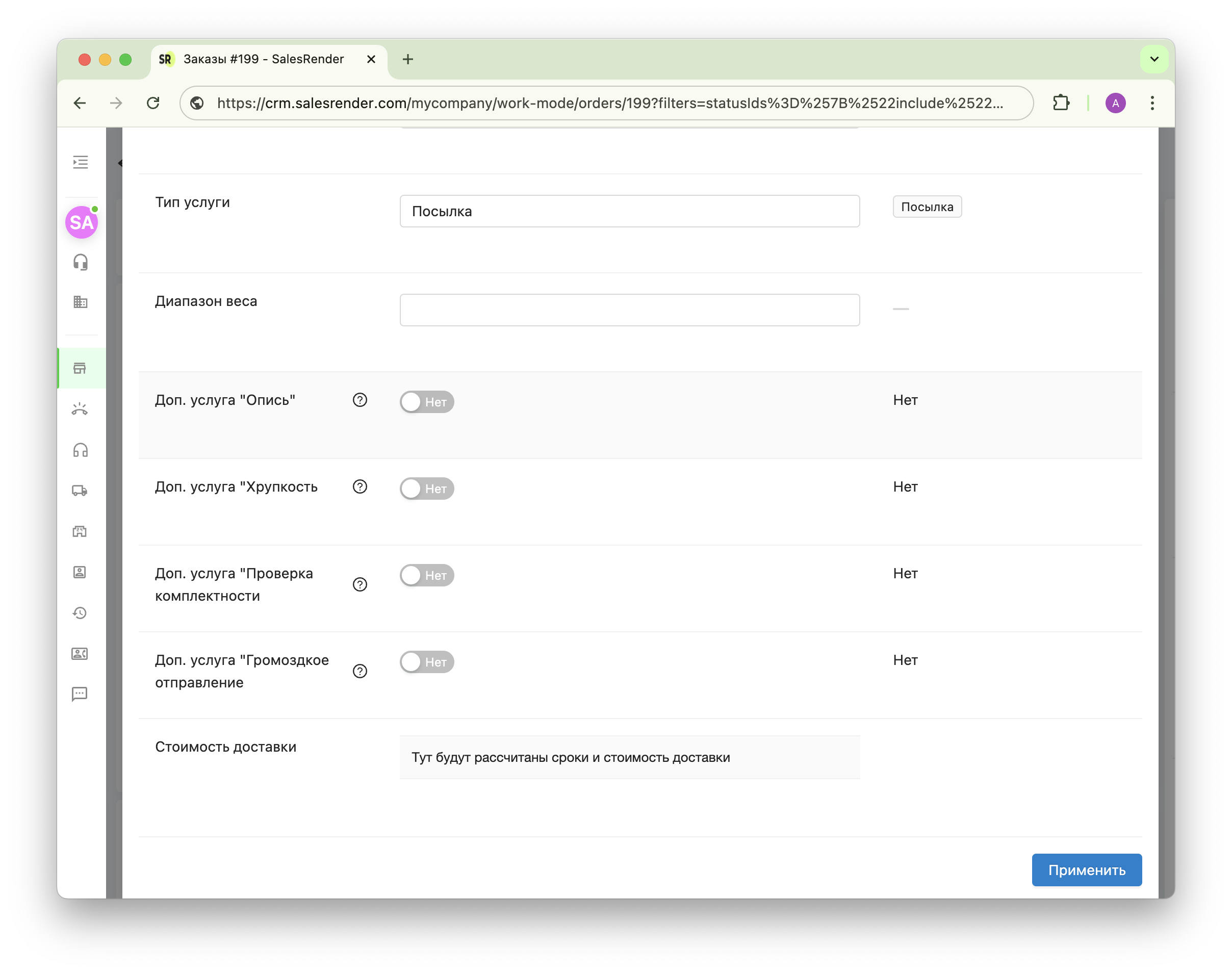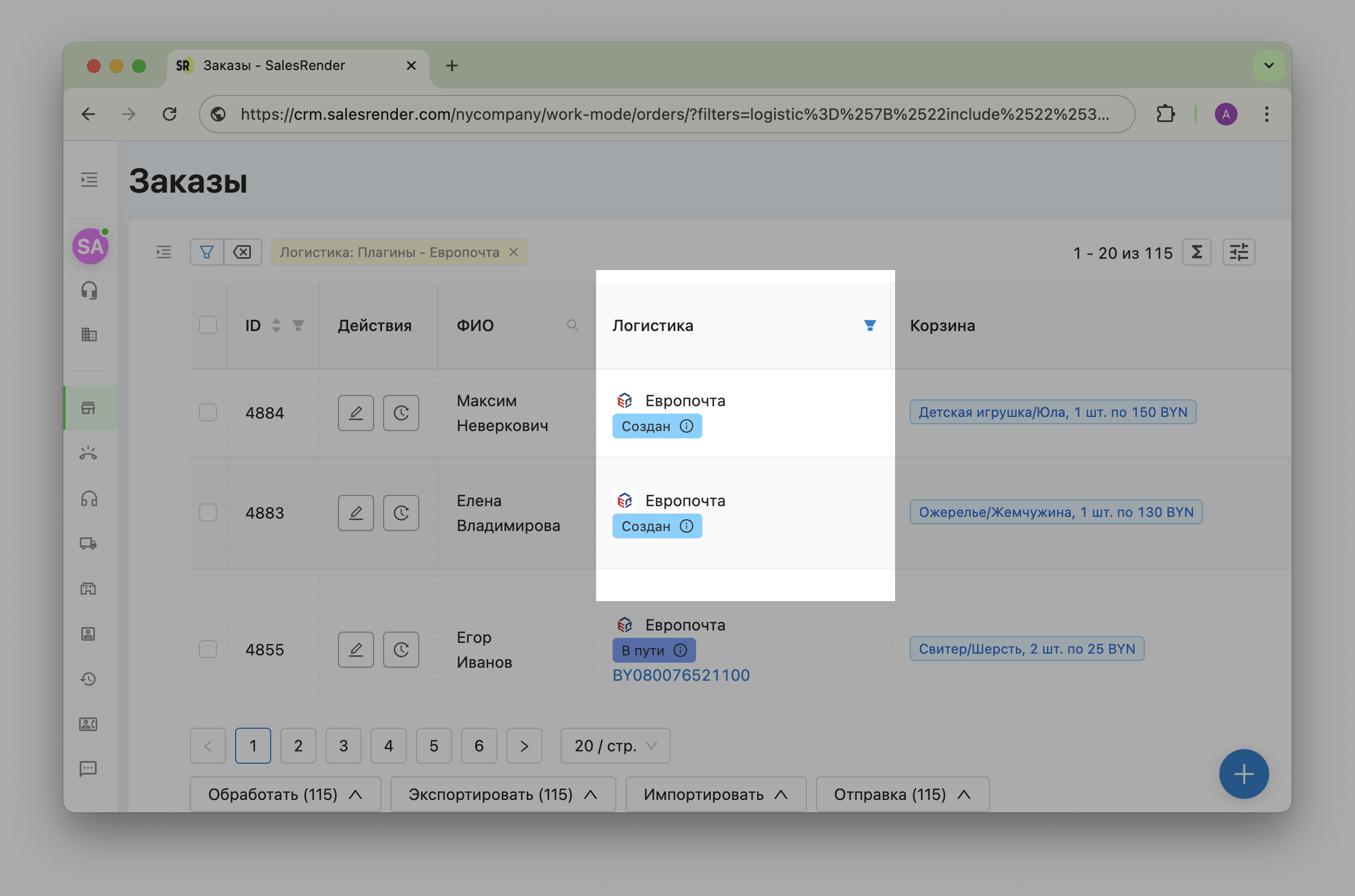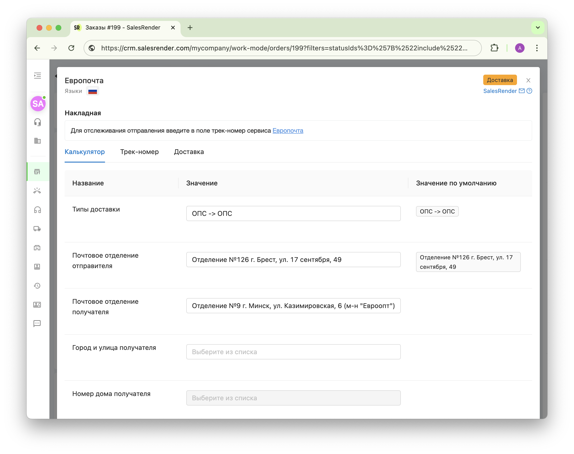 Когда накладная создана, она сохраняется в заказе в блоке “Логистика”. Пока еще без трек-номера, так как Европочта еще не знает ничего об этой посылке. Накладная пока что создана только на стороне CRM SalesRender.