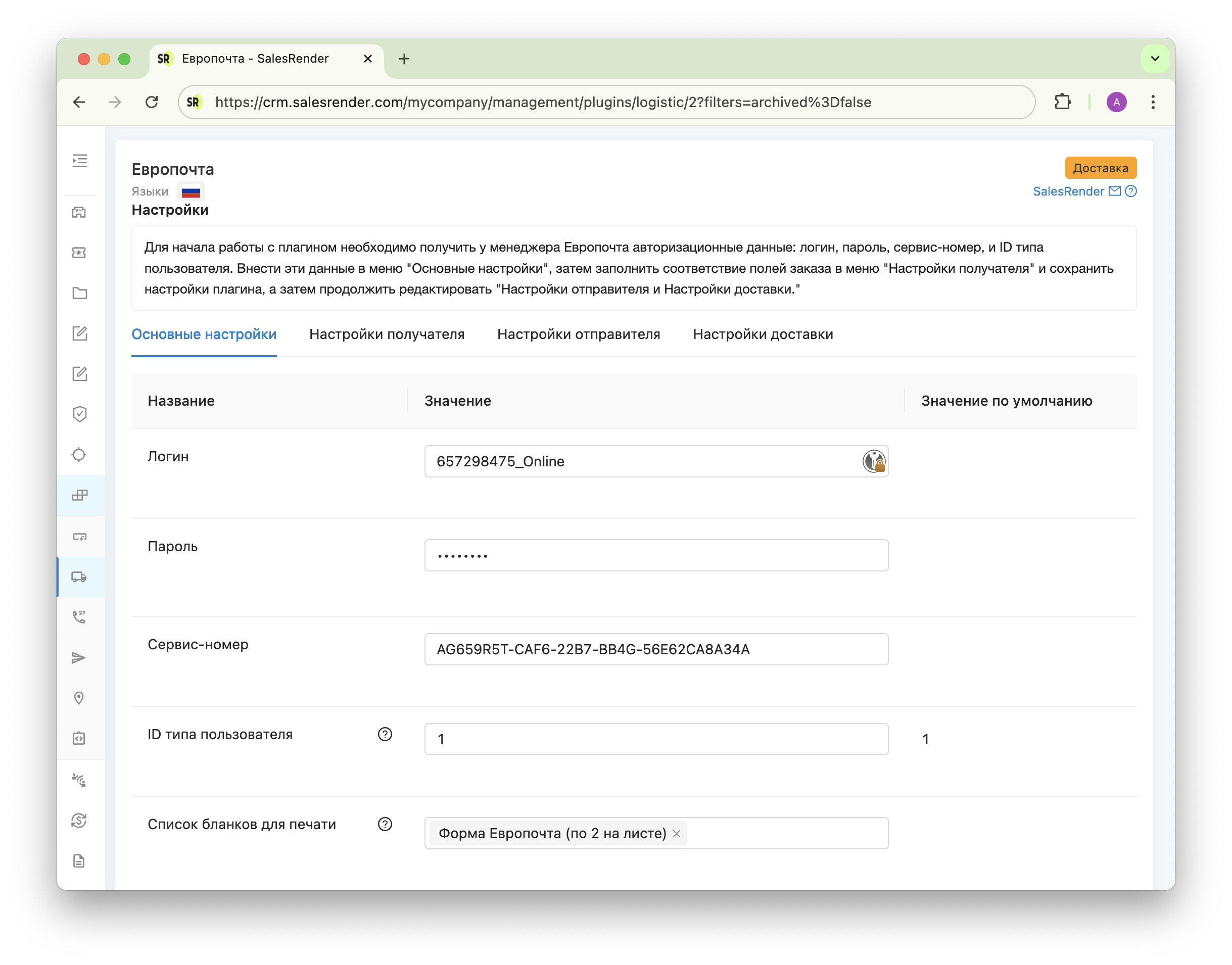 Чтобы интеграция работала, предварительно вы должны получить у менеджера Европочты доступ к API, а точнее сервисный номер. Без него интеграция невозможна.